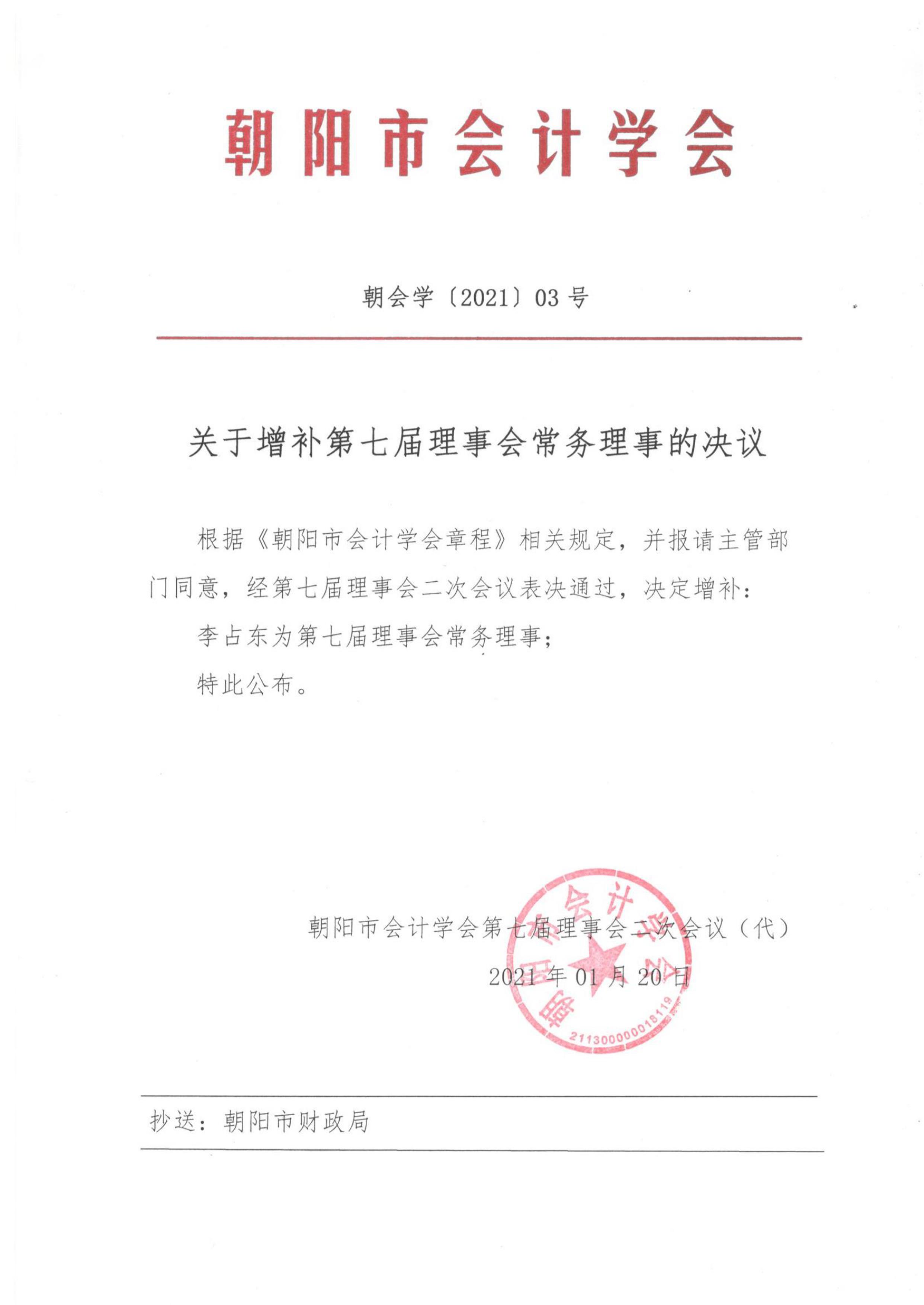 朝陽市會計學會關于增補第七屆理事會理事、常務理事的決議